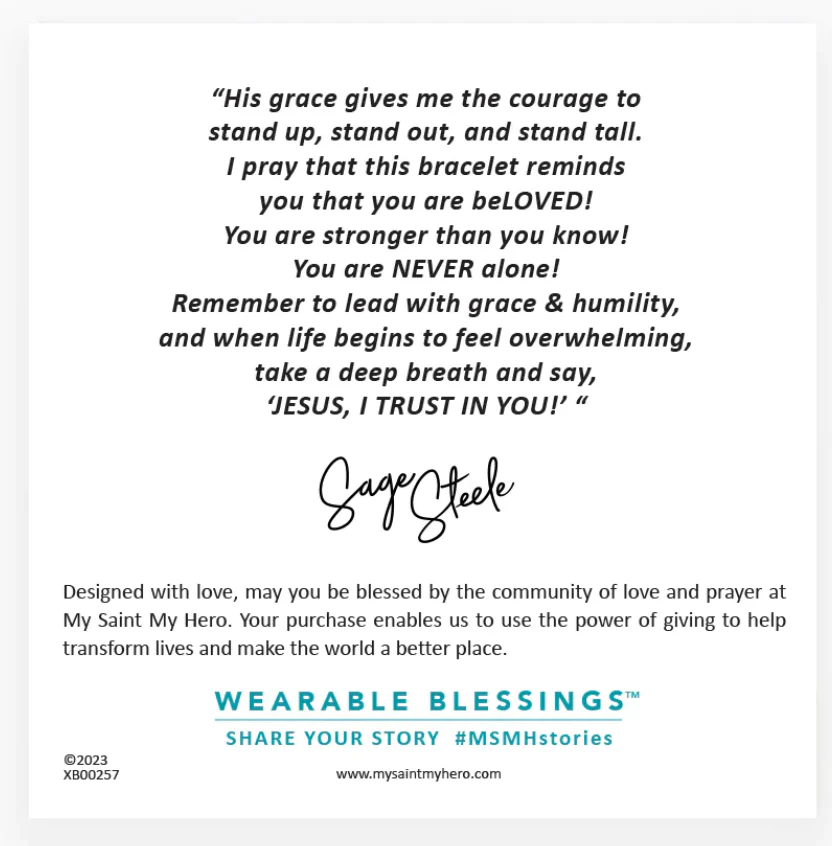 His grace gives me the courage to stand up, stand out, and stand tall. I pray that this bracelet reminds you that you are beLOVED! You are stronger than you know! You are NEVER alone! Remember to lead with grace & humility, and when life begins to feel overwhelming, take a deep breath and say, 'JESUS, I TRUST IN YOU!'“ —Sage Steele